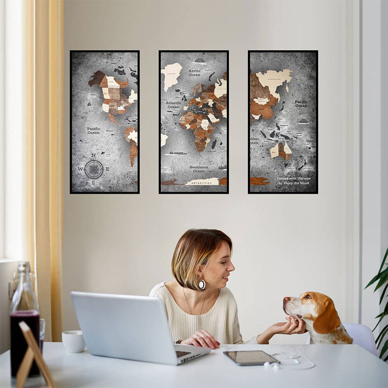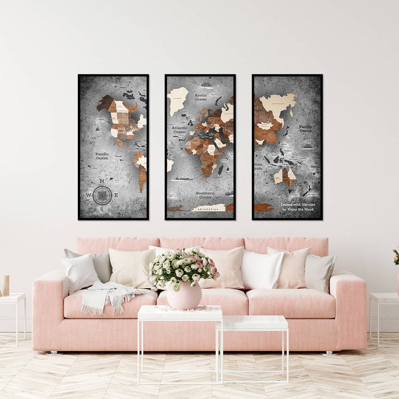 Vďaka šiestim dostupným vibrujúcim pozadiam - Vintage, Dark, Concrete, Ocean, Space a Oil Painting - táto mapa v tvare triptychu dokonale ozdobí aj tú najnudnejšiu stenu! Či už chcete vyzdobiť detskú izbu, obývaciu izbu, spálňu alebo pracovňu - Triptych nástenné umenie zarámované a predinštalované na doske sa stane ústredným bodom každého priestoru. Od industriálneho a minimalistického až po prírodný a moderný - na type interiéru nezáleží, pretože drevená mapa sa bude dobre hrať s každou farebnou paletou a štýlom.