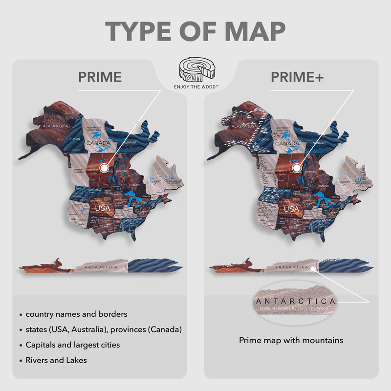 UPOZORNENIE: Mapa nie je geografická; možno vynechať niektoré menšie krajiny a ostrovy. Každá mapa je jedinečná a odtiene sa líšia, pretože je vyrobená z prírodného dreva.