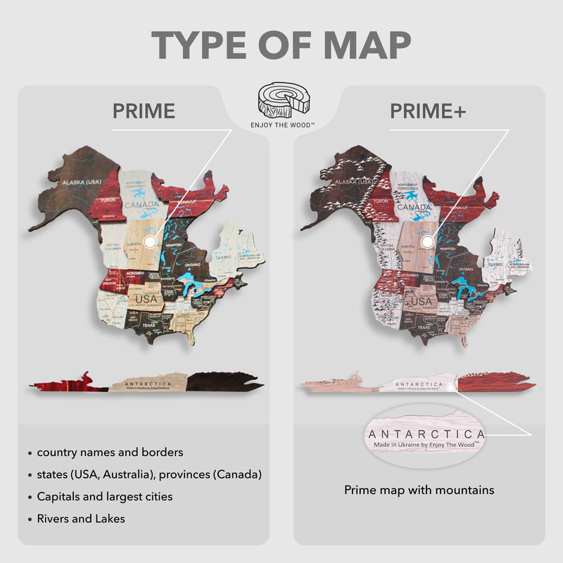 UPOZORNENIE: Mapa nie je geografická; možno vynechať niektoré menšie krajiny a ostrovy. Každá mapa je jedinečná a odtiene sa líšia, pretože je vyrobená z prírodného dreva.
