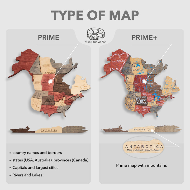 UPOZORNENIE: Mapa nie je geografická; možno vynechať niektoré menšie krajiny a ostrovy. Každá mapa je jedinečná a odtiene sa líšia, pretože je vyrobená z prírodného dreva.