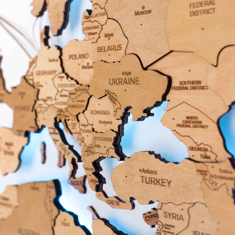 UPOZORNENIE: Mapa nie je geografická; možno vynechať niektoré menšie krajiny a ostrovy. Každá mapa je jedinečná a odtiene sa líšia, pretože je vyrobená z prírodného dreva.