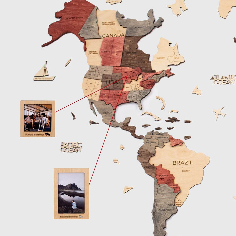 Naša 3D drevená mapa sveta, farebná a odolná, je tu na to, aby splnila základný účel vo vašej domácnosti – pamäť a inšpiráciu. Všetci predsa radi spomíname na minulé cesty a plánujeme nové vzrušujúce výlety! Určite sa inšpirujete na nové dobrodružstvá a zároveň budete mať vo svojom interiéri kreatívny kúsok dekorácie.