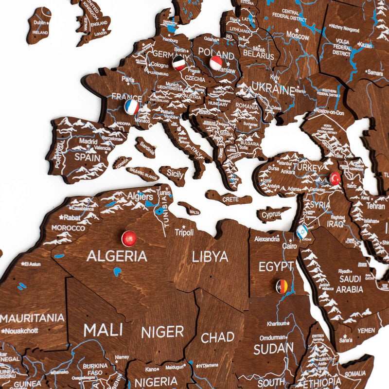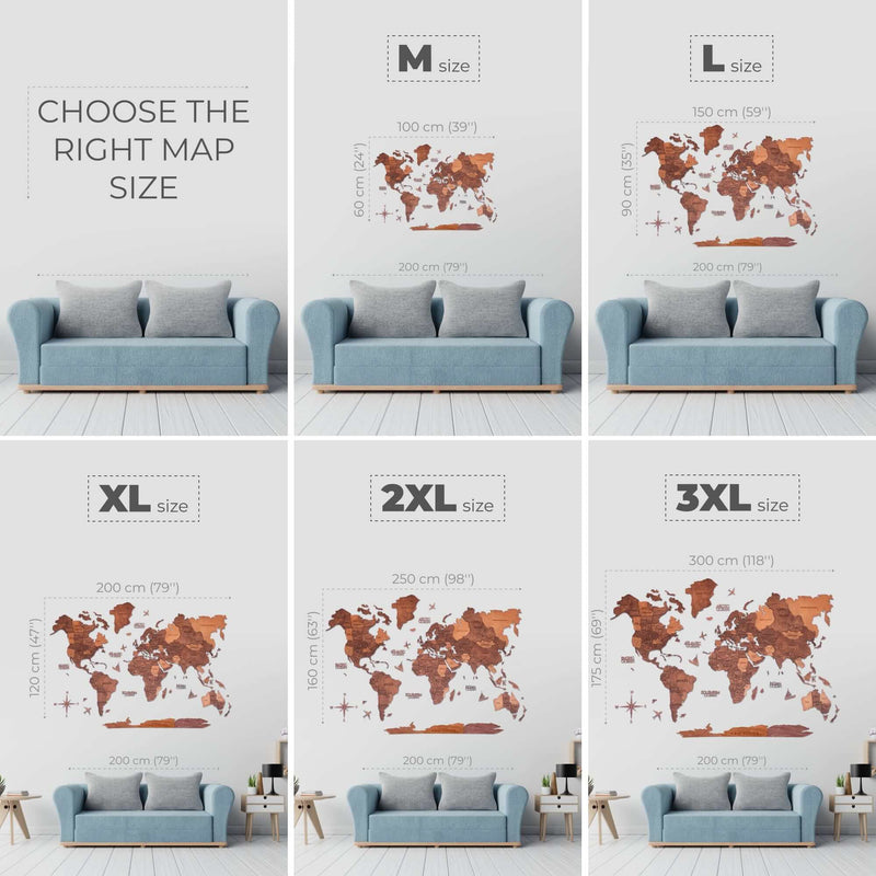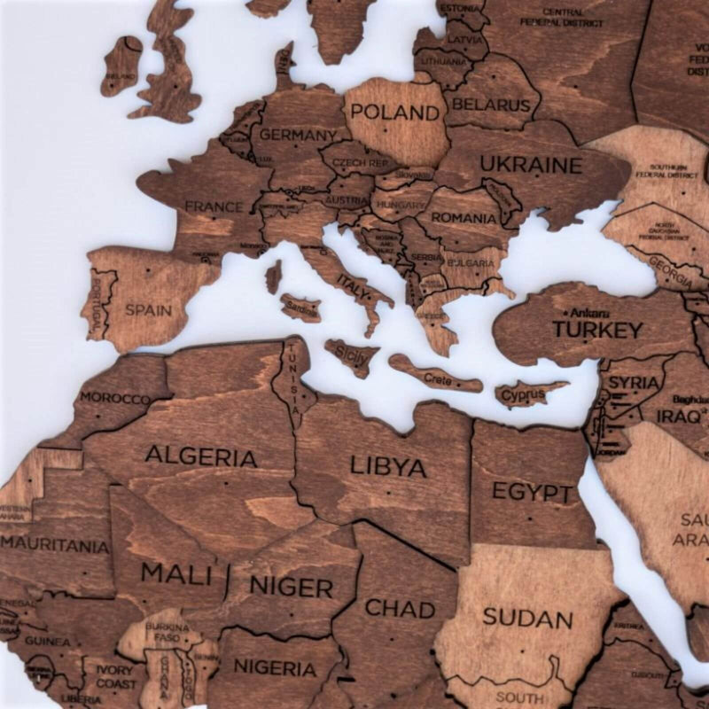 UPOZORNENIE: Mapa nie je geografická, niektoré menšie krajiny a ostrovy môžu byť vynechané. Každá mapa je jedinečná a odtiene sa líšia, pretože je vyrobená z prírodného dreva.