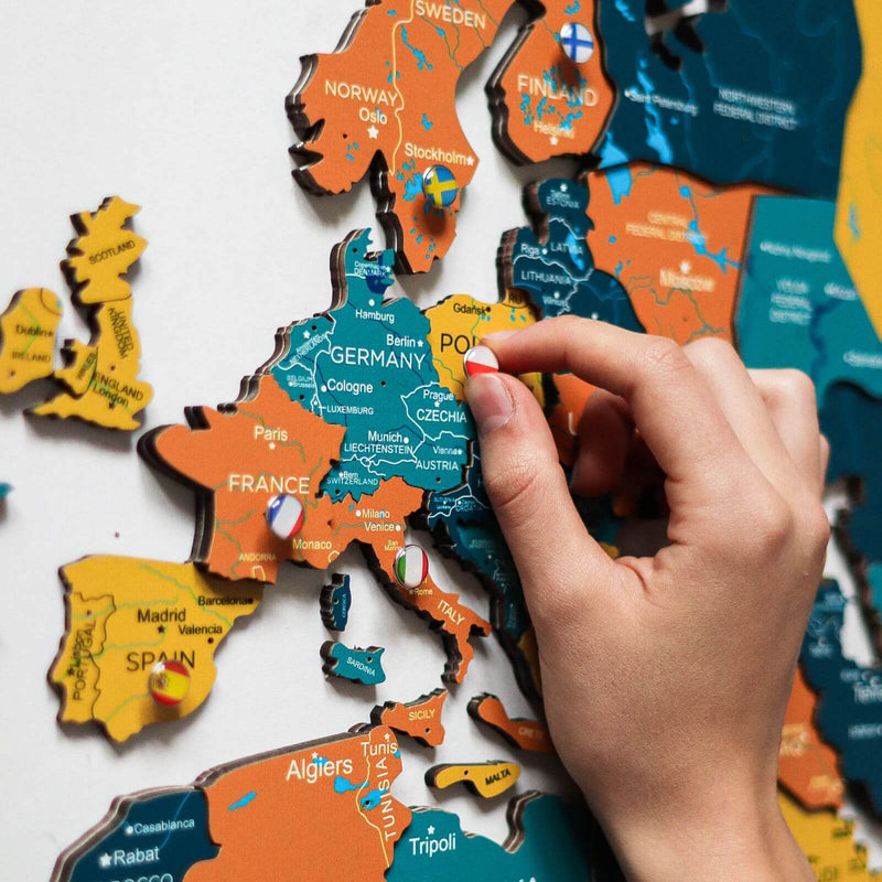 Mapa nie je geografickou pomôckou, pretože niektoré malé ostrovy a mestá sú vynechané. S deťmi si však môžete pripnúť miesta, ktoré by ste radi navštívili alebo ktoré ste už navštívili. Alebo jednoducho objavte, aký veľký je svet, a podporte v malých deťoch túlavosť a lásku k zemepisu.