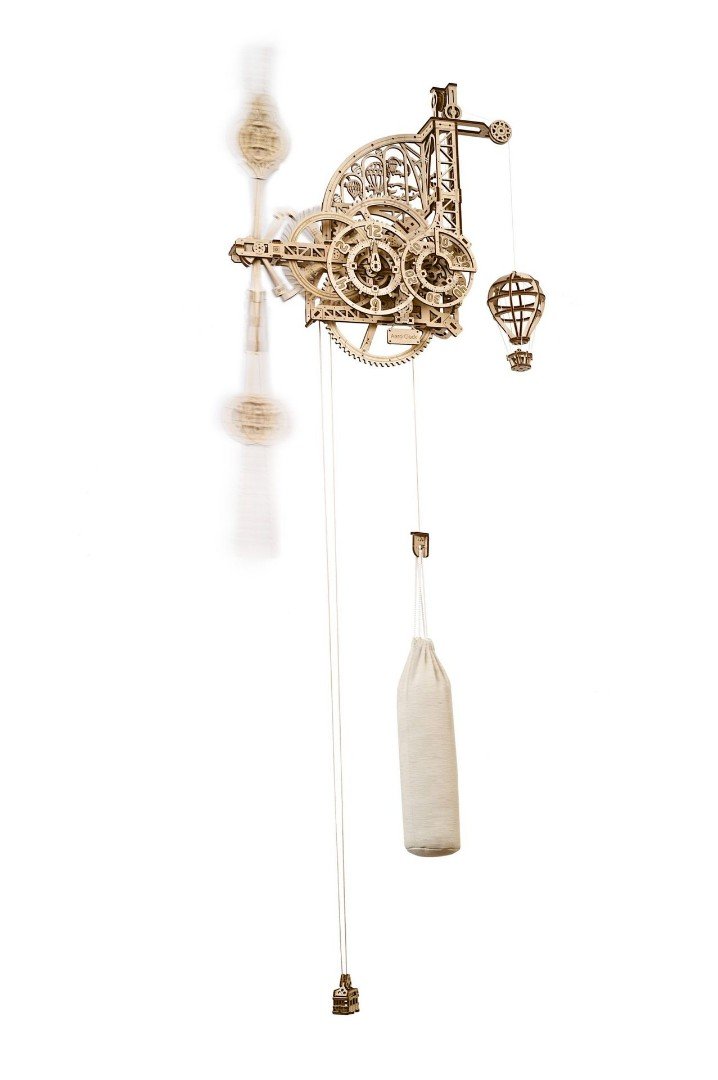Tieto jednoduché, ale elegantné hodiny Ugears sú poháňané gravitačnou silou, ktorá ťahá dole zaťažený vak (vrece môžete naplniť pieskom alebo soľou). Zdvihnite vak na jeho kladkách, aby ste natiahli hodiny. Keď závažie pomaly klesá, otáča hnacie koleso, ktoré potom otáča únikové koleso cez reduktor. Hodiny sú vybavené nastaviteľným váženým kyvadlom, ktoré interaguje s únikovým kolesom prostredníctvom stáleho tikotu kotviaceho mechanizmu. Činnosť tikania hodín môžete nastaviť na sekundu posunutím horného a spodného závažia kyvadla. Reduktor tiež prenáša rotáciu na hodinový kotúč a minútový kotúč. Jednou zo zaujímavých funkcií našich aero hodín je, že čas sa nečíta otáčajúcimi sa ručičkami na ciferníku, ale pevný ukazovateľ ukazuje čas na pomaly sa otáčajúcich, očíslovaných kotúčoch hodín a minút. Navyše sa tieto disky otáčajú proti smeru hodinových ručičiek - vedeli ste, že pred štandardizáciou sa niektoré hodiny pohybovali v smere hodinových ručičiek, kým iné proti smeru hodinových ručičiek? V úlohe "kukučky" Ugears Aero Clock predstavuje model teplovzdušného balóna. Zavesený balón rýchlo klesá, keď odbije hodina, a potom v priebehu ďalšej hodiny opäť pomaly stúpa.
