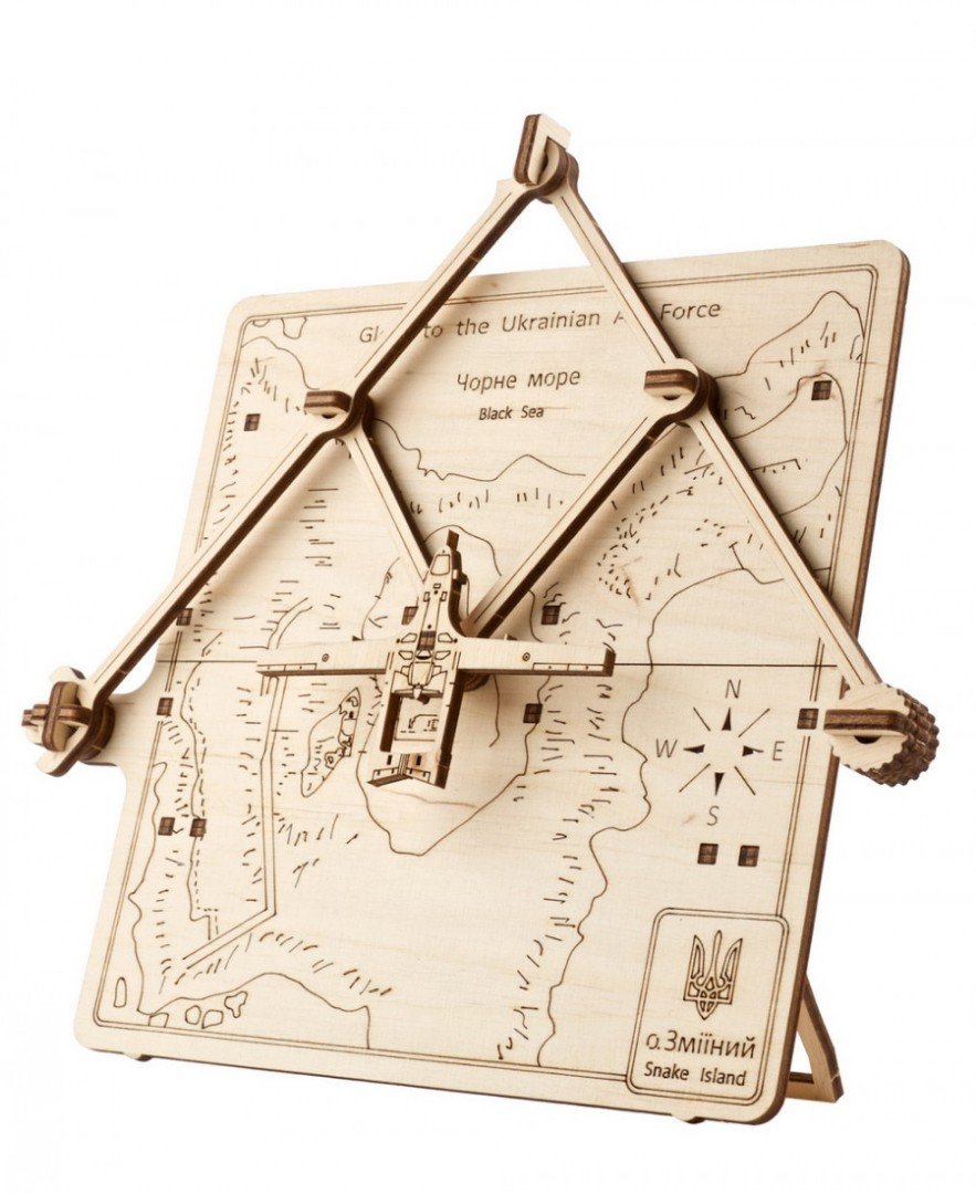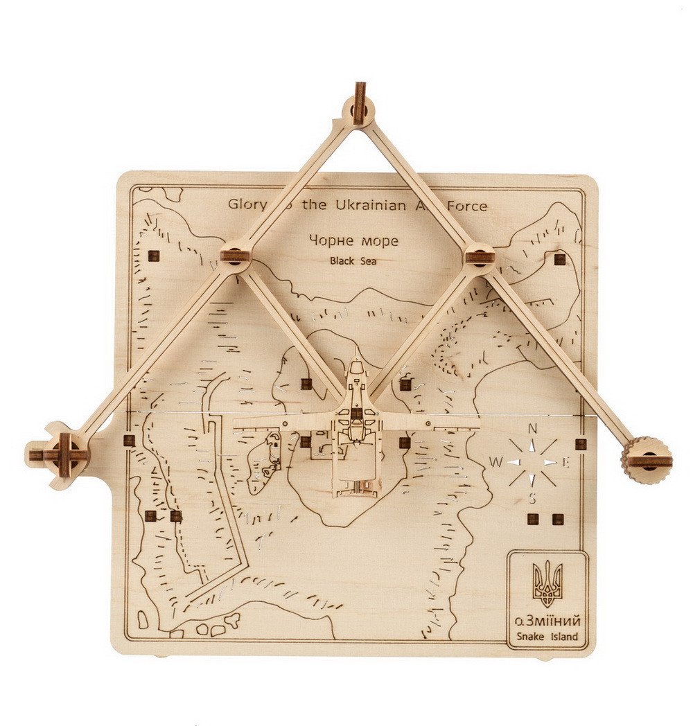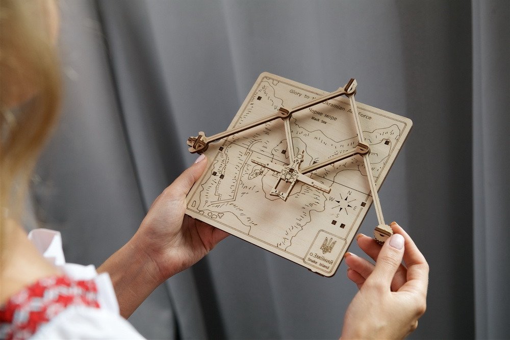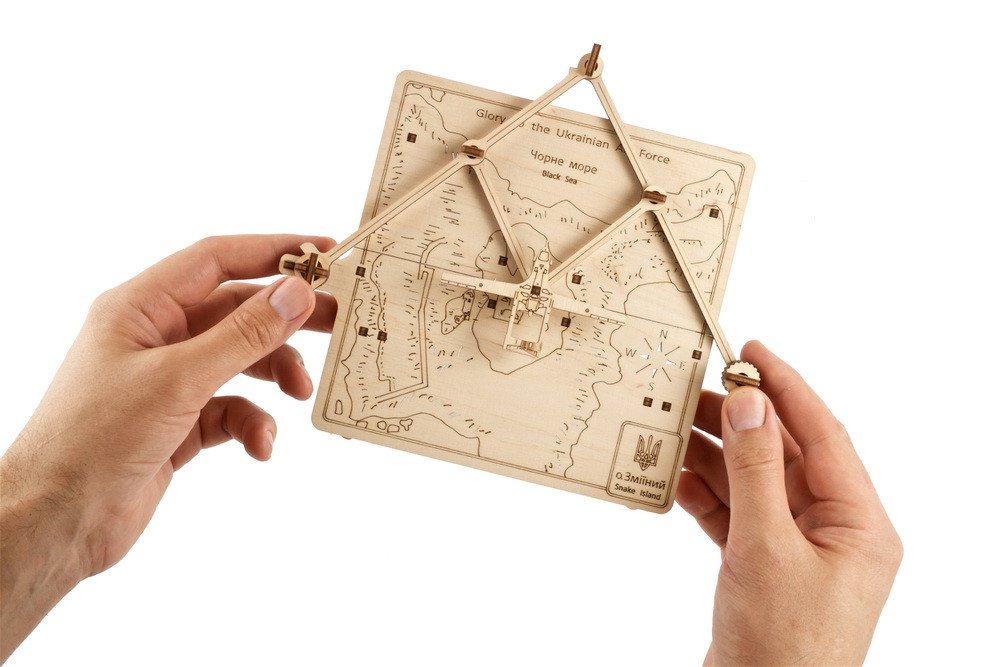 Model Oslobodenie Hadieho ostrova je mechanickým vyobrazením bezpilotného bojového lietadla Bayraktar letiaceho nad ukrajinským Hadím ostrovom v Čiernom mori, ktorý bol 24. februára obsadený Rusmi a 7. júla oslobodený. Pomocou systému typu pantograf môžete Bayraktar presúvať po mape ostrova. Na zadnej strane modelu sú nožičky, takže mechanický model môžete umiestniť na viditeľné miesto a tešiť sa z neho s rodinou a priateľmi.