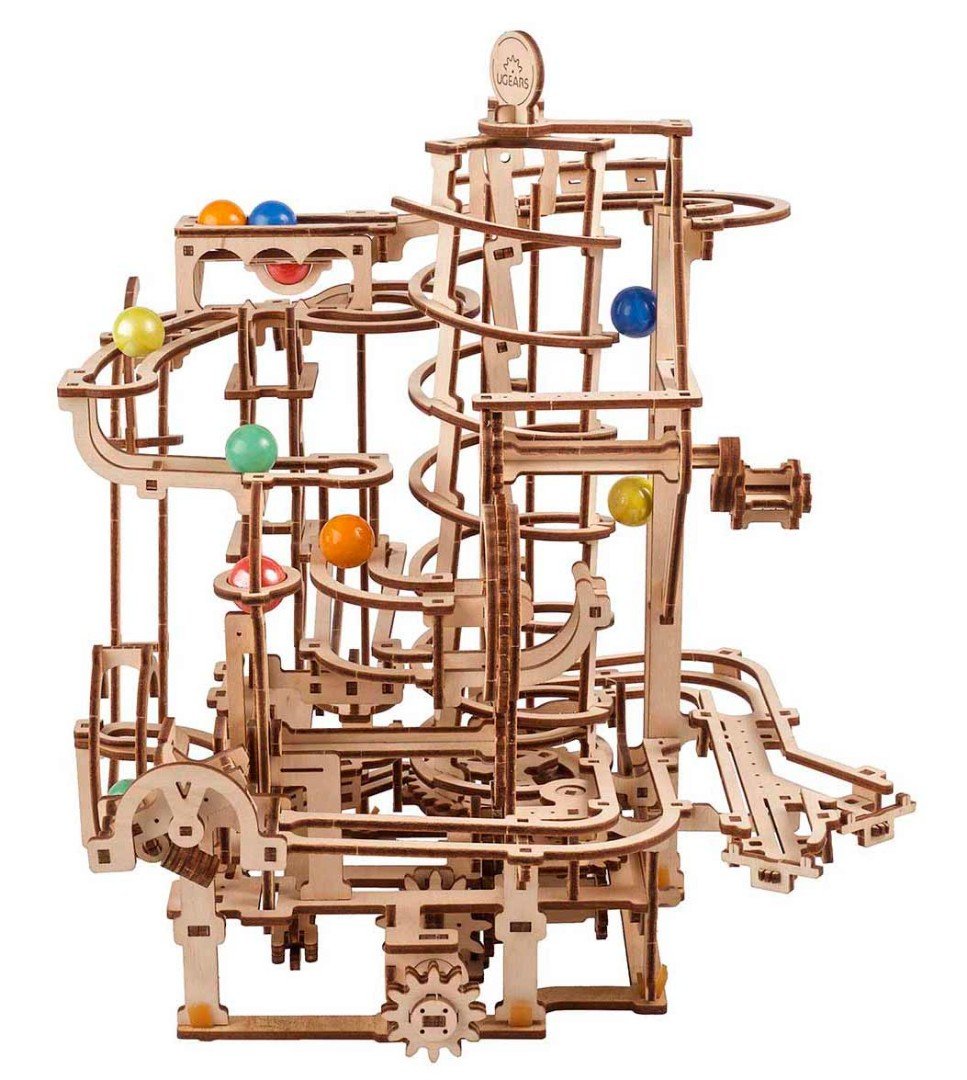 Drevený mechanický model Marble dráha Špirálový dopravník je štvrtou Marble dráhou zo vzrušujúcej kolekcie Ugears. Tento model funguje vďaka manuálnemu pohonu. Dopravník má dva typy koľajníc, čo urýchľuje čas zdvíhania guľôčky - hlavné špirálové koľajnice a dodatočné vertikálne koľajnice. Keď otočíte gombíkom v smere hodinových ručičiek, dvojkoľajnicový špirálový dopravník zdvihne farebné sklenené guľôčky nahor (jedna gulička sa zdvihne nahor v deviatich otáčkach navíjacieho gombíka). Odtiaľ guľôčky vstupujú do násypky s tromi guľôčkami a tromi zostupnými dráhami: rýchlostná šmýkačka, vertikálna hadica a dráha horskej rieky s efektom zastavenia guľôčky.
