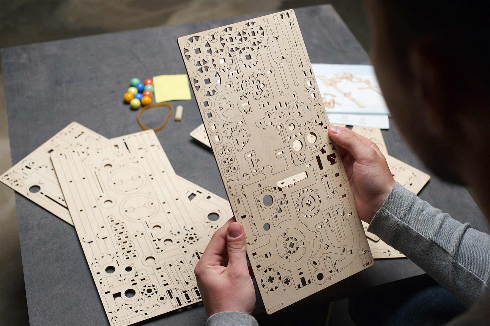 Model pozostáva z 266 dielov a má zvýšenú úroveň obtiažnosti. Dokončenie tejto Marble dráhy vám zaberie 6 hodín a sľubujeme, že si pri tom užijete veľa zábavy. Pri montáži nebudete potrebovať lepidlo ani iné nástroje. Všetky diely sú starostlivo vyrezané laserom do preglejkových dosiek, odkiaľ sa ľahko vyberajú a spájajú medzi sebou. V sade nájdete ilustrovaný návod krok za krokom v 11 jazykoch (angličtina, nemčina, francúzština, španielčina, taliančina, poľština, ukrajinčina, japončina, čínština, kórejčina, ruština), ktoré vám pomôžu zostaviť model bez väčších ťažkostí.