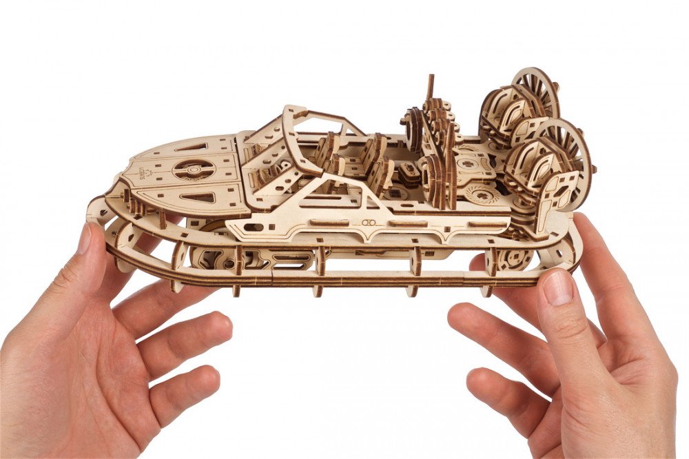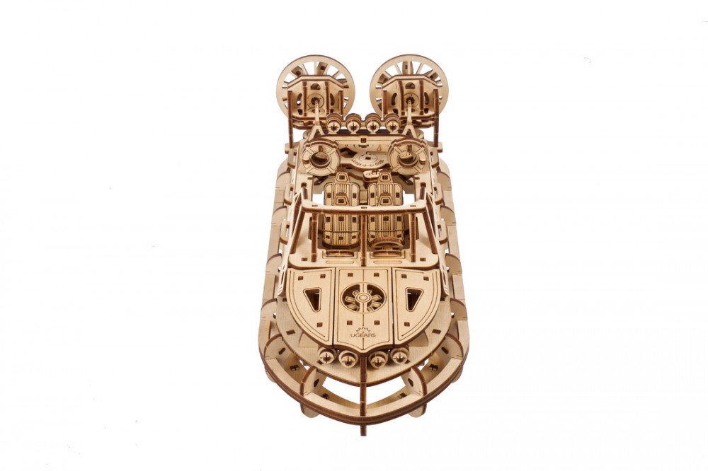 Tento DIY drevený model je poháňaný pružinovým motorom s naťahovacím račňovým kľúčom umiestneným na podvozku plavidla. Prepínač Štart/Stop vám umožňuje natiahnuť motor desiatimi otáčkami v smere hodinových ručičiek, potom zapnúť motor, keď sa dve tlačné vrtule roztočia a loď vykoná elegantné, vopred naprogramované otáčky doľava a doprava na vzdialenosť 3 metrov, napodobňujúce jemné kývanie skutočného vznášadla