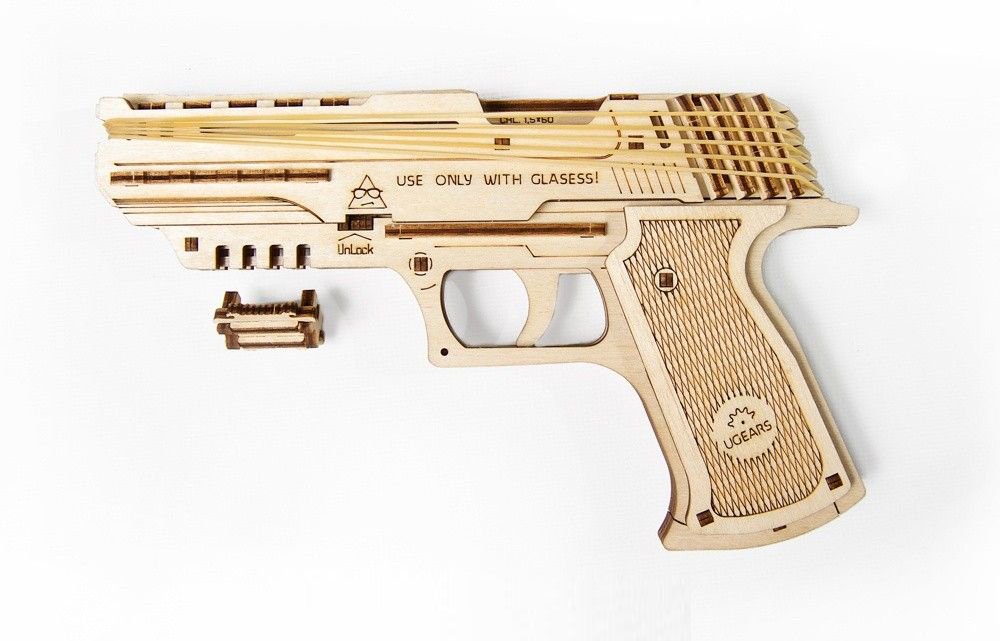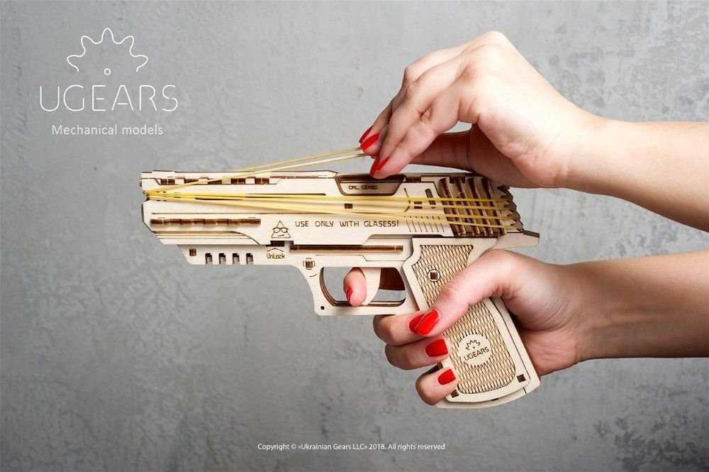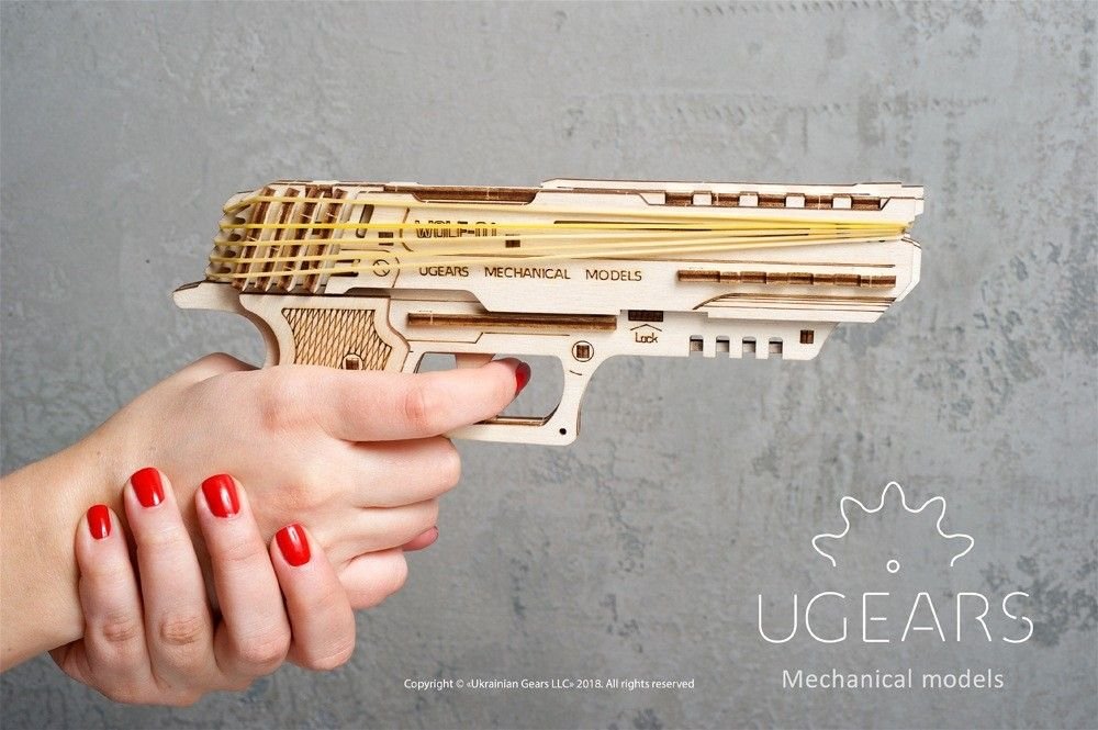 UGEARS predstavuje nový unikát do vašej zbierky drevených modelov - nabitý zábavou a zameraný na pozitívne emócie, mechanickú pištoľ Wolf-01.