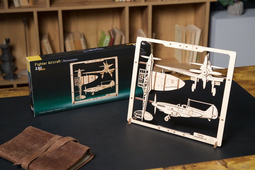 Obrázkové puzzle Stíhacie lietadlo 2,5D je zábavným projektom pre domácich majstrov a atraktívnym výstavným kúskom do každého domáceho alebo kancelárskeho interiéru. Puzzle Ugears 2,5D sú vyrobené z kompozitného dreva umeleckej kvality, majú rozpoznateľný dizajn Ugears a zostavujú sa bez lepidla alebo špeciálnych nástrojov. Stačí vyraziť laserom predrezané dieliky z dosiek a zacvaknúť ich do seba, aby vznikol kompletný model obrázka. Diváci môžu skúmať lietadlo z troch uhlov a zapájať sa do pohyblivých častí tohto historického modelu z obdobia druhej svetovej vojny.