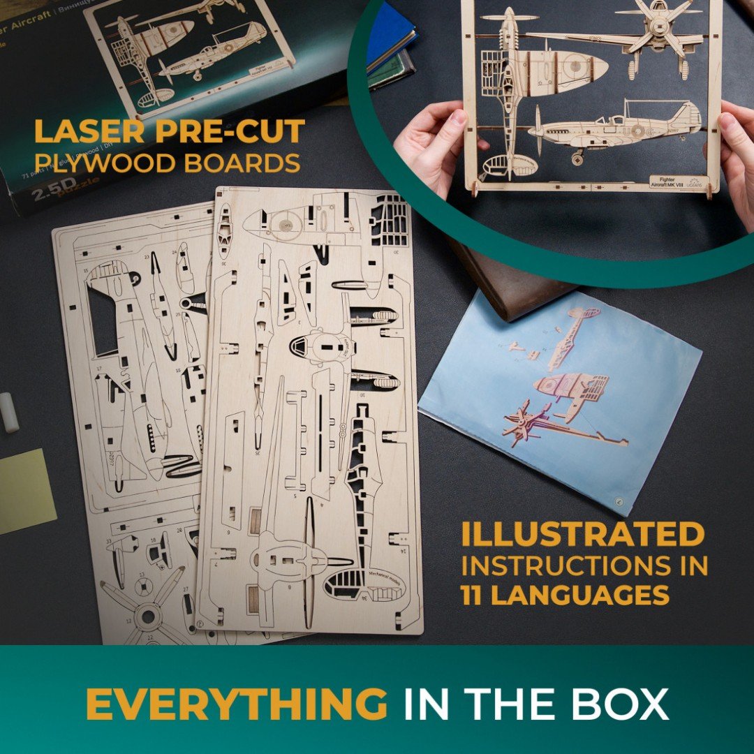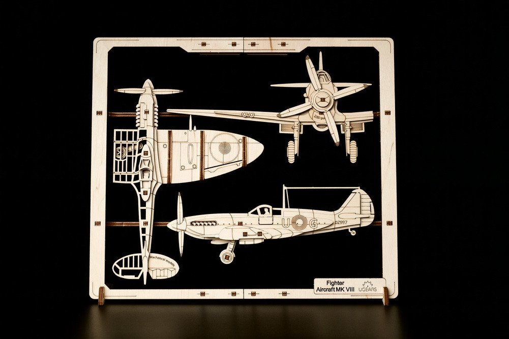 Spoločnosť Ugears hrdo predstavuje stíhacie lietadlo z našej kolekcie Klasické vozidlá - prvú sériu v rade 2,5D puzzle Ugears! Tento parádny DIY 2,5D drevený model lietadla má pohyblivé prvky a dodáva sa vo vlastnom ráme, ktorý je vhodný na zavesenie na stenu alebo umiestnenie na stôl či poličku. Stíhacie lietadlo znázorňuje klasický Spitfire z obdobia 40. rokov 20. storočia, slávnu stíhačku z druhej svetovej vojny, ktorú používalo RAF a ďalší spojenci. Obrázkový model predstavuje 3 perspektívy (pohľad spredu, zhora a zboku) a má niekoľko pohyblivých častí vrátane krídielka, vrtule, kolesa a vrchlíka, ktoré oživia vaše puzzle!