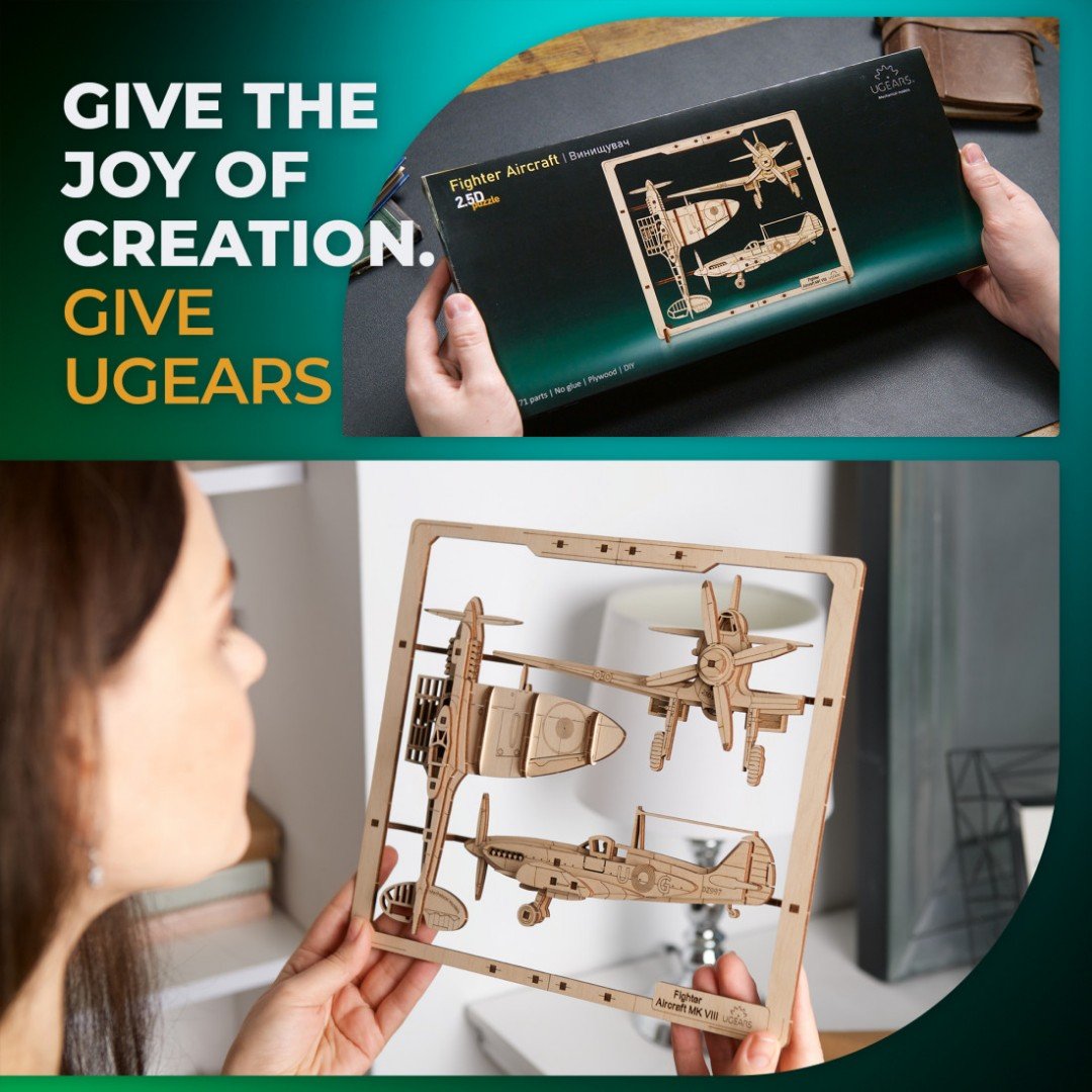 Začnite svoju zbierku drevených 2,5D obrázkových puzzle Ugears ešte dnes so stíhacím lietadlom, potom sa rozvetvite a preskúmajte nádherný svet mechanických 3D puzzle Ugears vrátane áut, nákladných áut, lodí, motoriek, automatov, robotov, drevených skladačiek a stavebníc STEM Lab.