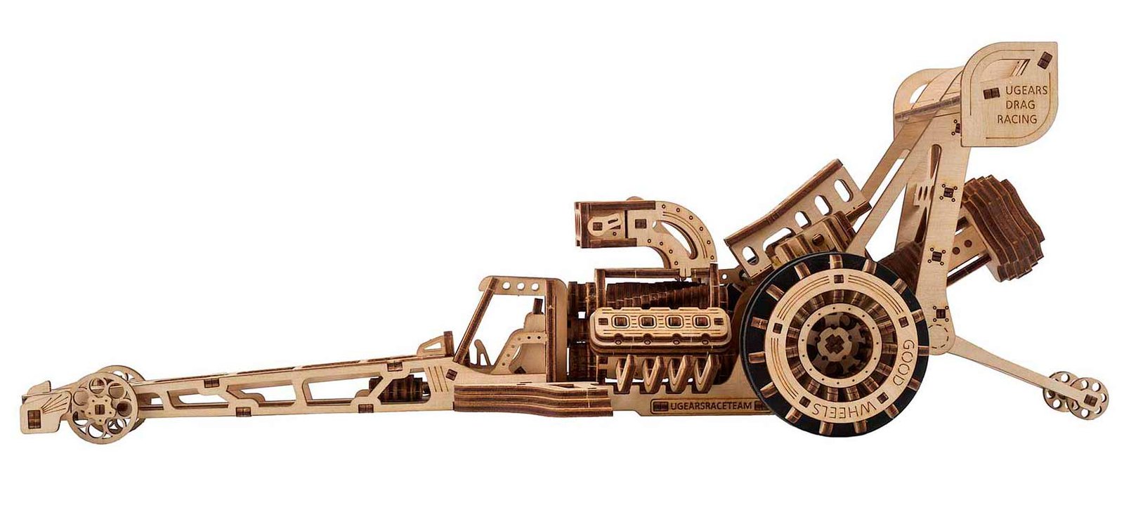Len jeden pohľad na drevený mechanický model Ugears Dragster vám prezradí, že toto nie je len obyčajné autíčko. Model je poháňaný pružinovým motorom a reduktorom, ktorý prenáša výkon cez kľukový hriadeľ a remeňový pohon (gumička prechádzajúca cez napínač s valčekom) na zadné kolesá, ktoré majú špeciálne silikónové tesnenia pre dodatočnú trakciu.