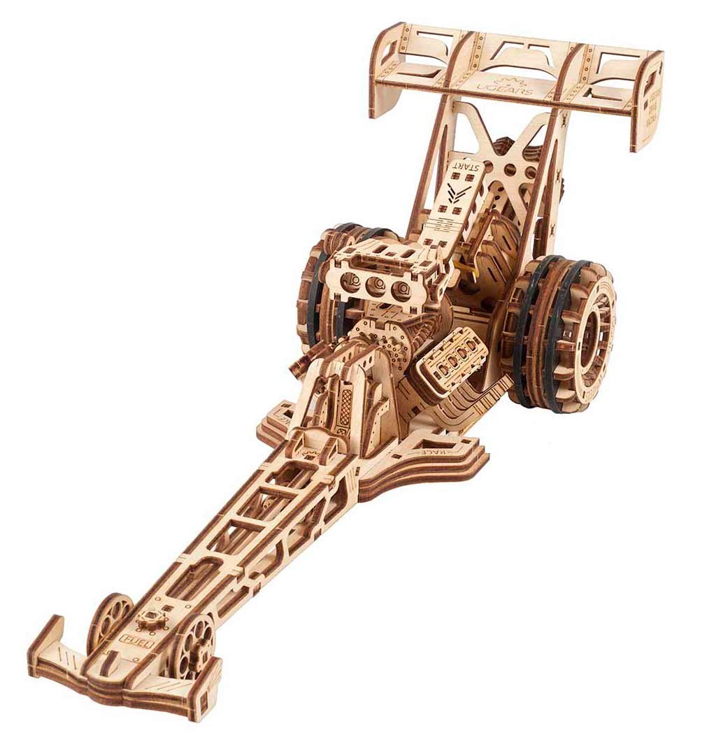 Len jeden pohľad na drevený mechanický model Ugears Dragster vám prezradí, že toto nie je obyčajné autíčko. Model je poháňaný pružinovým motorom a reduktorom, ktorý prenáša výkon cez kľukový hriadeľ a remeňový pohon (gumička prechádzajúca cez napínač s valčekom) na zadné kolesá, ktoré majú špeciálne silikónové tesnenia pre dodatočnú trakciu. Dragster má tlačidlo "Štart/Stop", variabilné jazdné režimy a dokáže sa počas jazdy postaviť na zadné kolesá, rovnako ako skutočný prototyp. Dragster má otvorený dizajn, ktorý odhaľuje krásu a úžasnú vnútornú mechaniku tohto auta. Ak chcete model ovládať, uistite sa, že spínač "Štart/Stop" je v polohe stop, potom otočte štartovacím gombíkom na zadnej strane Dragstera v smere hodinových ručičiek asi desaťkrát. Položte Dragster na podlahu a držte ho jednou rukou, prepnite do režimu "Štart" a potom ho pustite. Keďže ide o značku Ugears, ktorá vždy dbá na realistické detaily, vytvárajúce wow efekt, v tomto modeli sme sa vyhrali s klapkami prívodu vzduchu natoľko, aby sa v polohe "Stop" zatvorili a v polohe "Štart" otvorili!