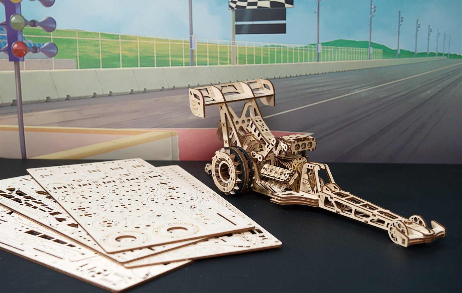 Dragster od Ugears. Zhromaždi ma. Osloboďte moju superschopnosť!