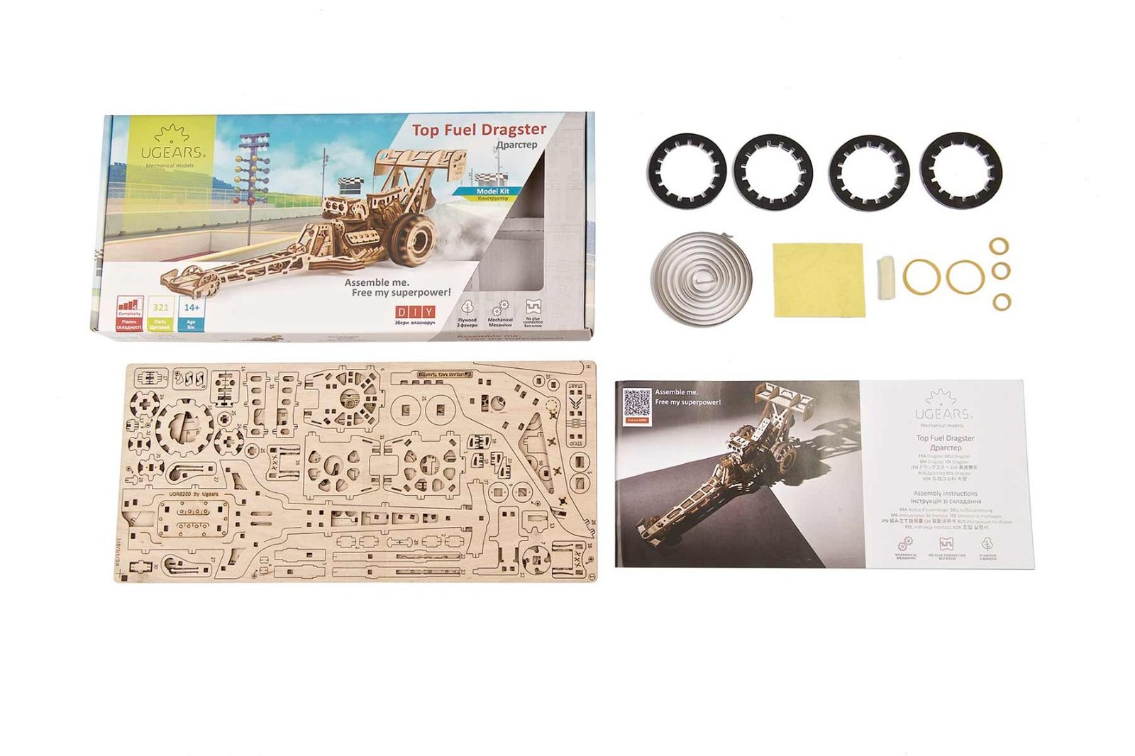 Skutočné dragstery majú životnosť motora len 3 minúty vrátane zahrievania. Po každom 4-sekundovom chode sa rozoberú, skontrolujú a vyčistia; vymieňajú sa poškodené alebo opotrebované diely (spojka, piesty, ojnice, krúžky, zapaľovacie sviečky); a motor sa úplne zotaví približne za 40 minút, kedy je znovu pripravený na štart. Náš úžasný drevený mechanický Dragster nevyžaduje takúto vysokú úroveň údržby, ale uistite sa, že všetky pohyblivé časti sú správne obrúsené a namazané pre optimálny výkon. Starostlivo dodržiavajte podrobné pokyny dostupné v 11 jazykoch (angličtina, nemčina, ukrajinčina, francúzština, poľština, španielčina, ruština, japončina, taliančina, čínština a kórejčina), aby bol proces montáže čo najpohodlnejší.
