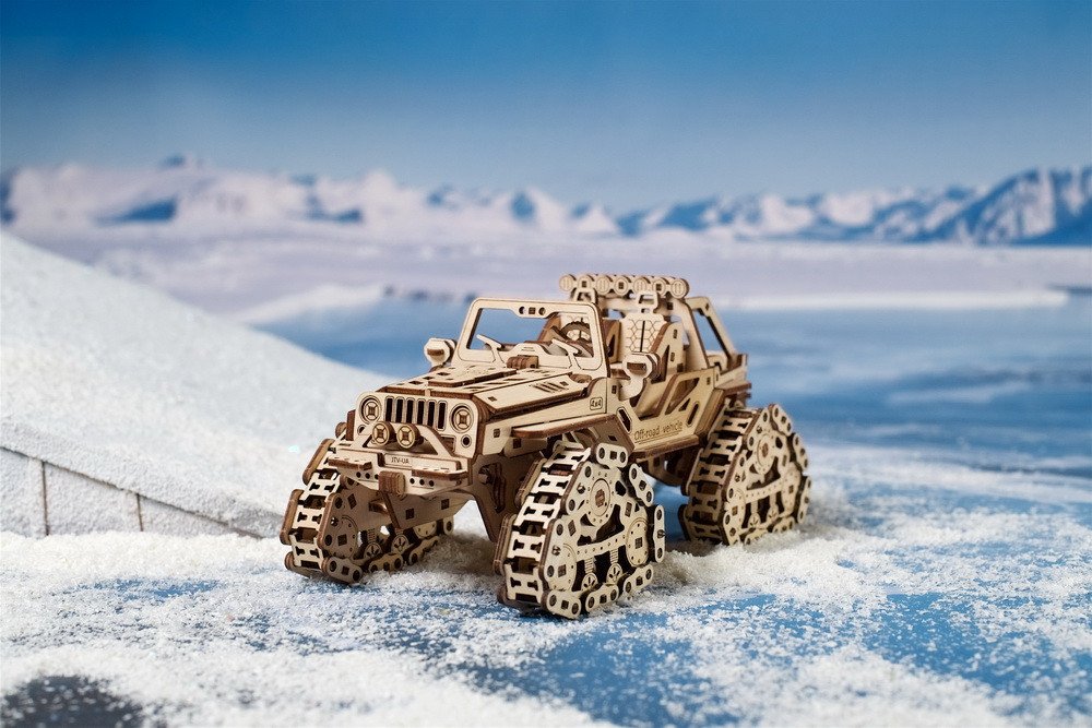 Náš drevený model ORV v mierke 1:24 má pružinový motor, ktorý mu umožňuje prejsť viac ako tri metre v režime „D“ (Drive) a viac ako štyri metre v režime „S“ (Sport), otvorená kabína, štyri kolesá pohon, kapota, ktorá sa otvára a ukazuje motor, a bezpečnostné tyče vzadu, ale výnimočnou vlastnosťou sú štyri pásové moduly namiesto kolies.