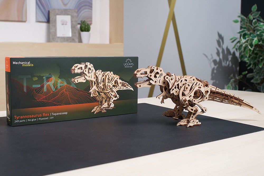 Tento mechanický DIY drevený model kráčajúceho tyranosaura je poháňaný kovovou pružinou, ktorá prenáša silu cez redukovaný prevod, otáčajúc osou, ktorá poháňa nohy. Dômyselný systém prepojení a spojení umožňuje tomuto kráľovi dinosaurov chodiť po vlastných nohách — prvé dvojpedálové chodítko v kolekcii Ugears! Excentrické ozubené koleso uvádza kývanie chvosta do synchrónneho pohybu s nohami, čo pomáha dinosaurovi udržať rovnováhu a nespadnúť nabok, rovnako ako v prírode.