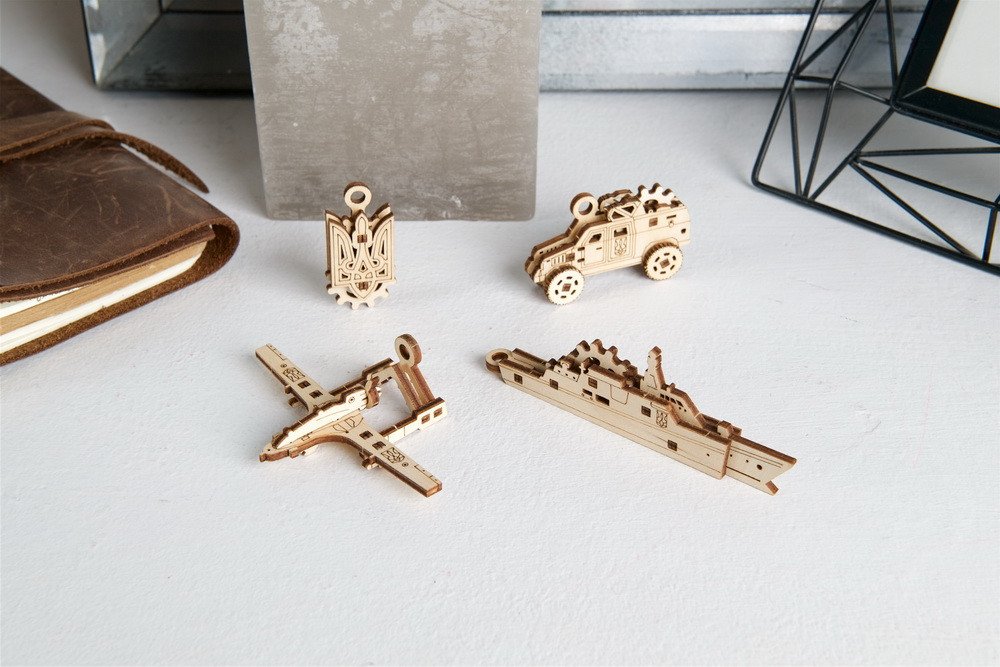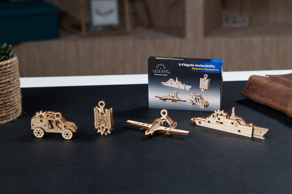 Séria U-Fidgets „Neporaziteľnosť“ od spoločnosti Ugears oslavuje bojového ducha ukrajinských ozbrojených síl. Súprava obsahuje štyri malé drevené figúrky, ktoré si sami zostavíte, pričom každá z nich má jednoduché mechanické prvky: