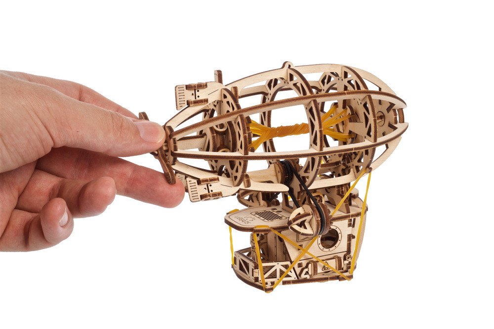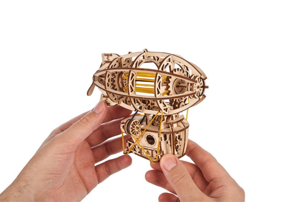 Vzducholoď Steampunk je zábavný a jednoduchý projekt pre každého, kto sa zaujíma o letectvo alebo stavbu modelov. Na stavbu tohto dreveného retro modelu vzducholode nebudete potrebovať lepidlo ani špeciálne nástroje. S 3D skladačkami a modelmi Ugears len vyrazíte laserom predrezané diely z ich umelecky kvalitných kompozitných drevených dosiek a zacvaknete ich do seba. Všetko potrebné nájdete v krabici vrátane návodu v 11 jazykoch (ukrajinčina, angličtina, nemčina, francúzština, poľština, španielčina, portugalčina, taliančina, japončina, čínština a kórejčina). Súčasťou stavebnice je aj kúsok brúsneho papiera a vosk, aby ste mohli vyhladiť a namazať pohyblivé časti a zaistiť tak bezproblémový chod vašej steampunkovej vzducholode.